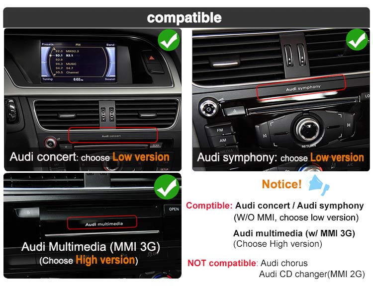 If your car without GPS (low configuration), the OEM radio is Audi concert/symphony, choose "Without MMI" , if it has original nav system (high configuration), the radio is "Audi Multimedia", it has MMI 3G system, please choose " With 3G MMI".